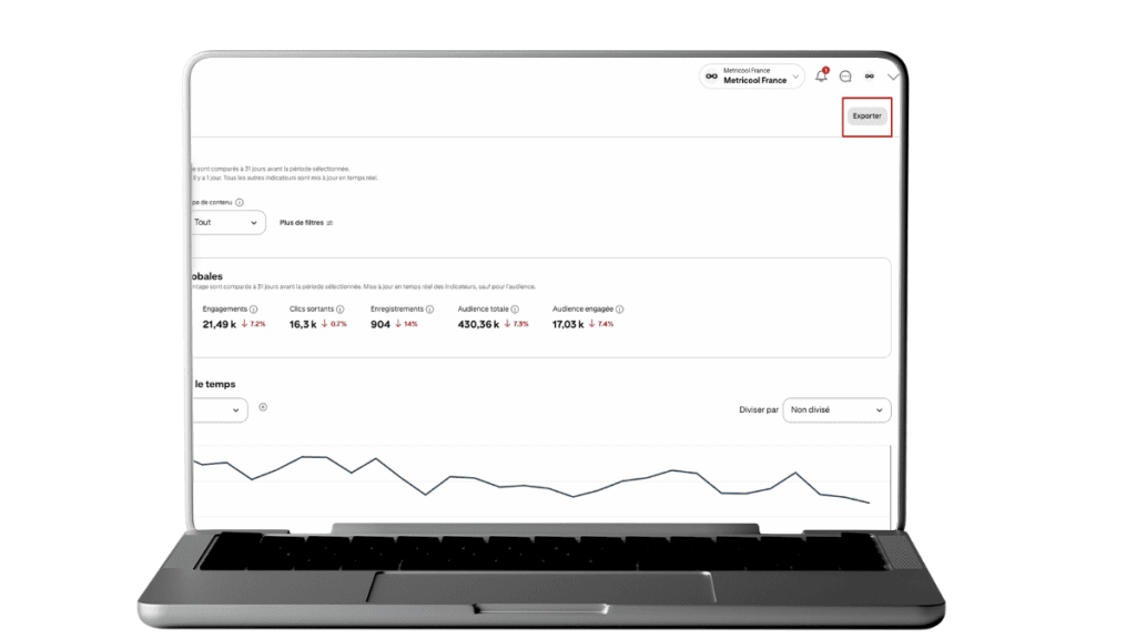 - Choisissez la tranche d’analyse dans l’onglet Période et sélectionnez l’indicateur principal (engagements, clics d’épingles, clics sortants, etc.) dans l’onglet Métrique. Cliquez ensuite sur le bouton Exporter en haut à droite pour télécharger vos données.