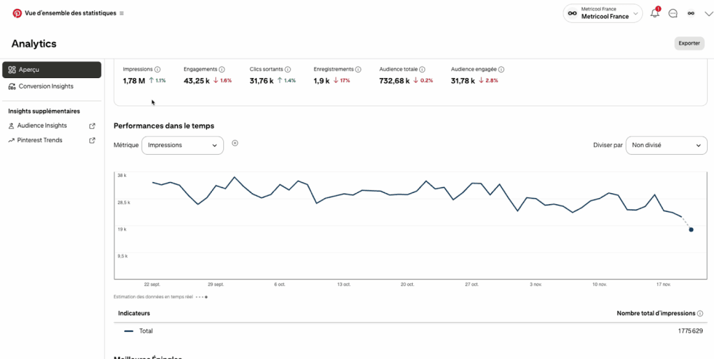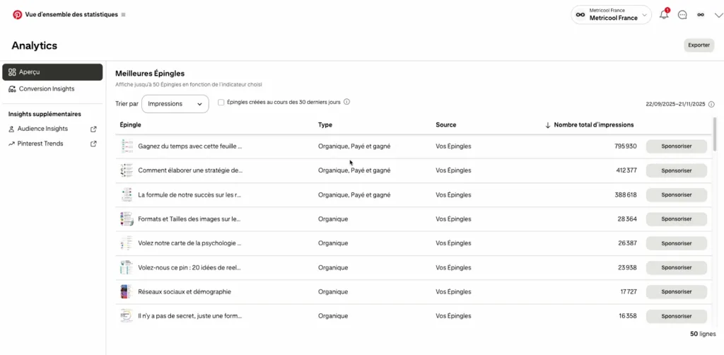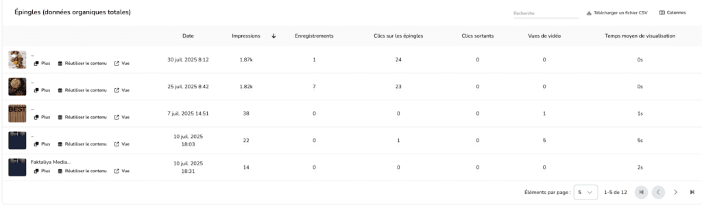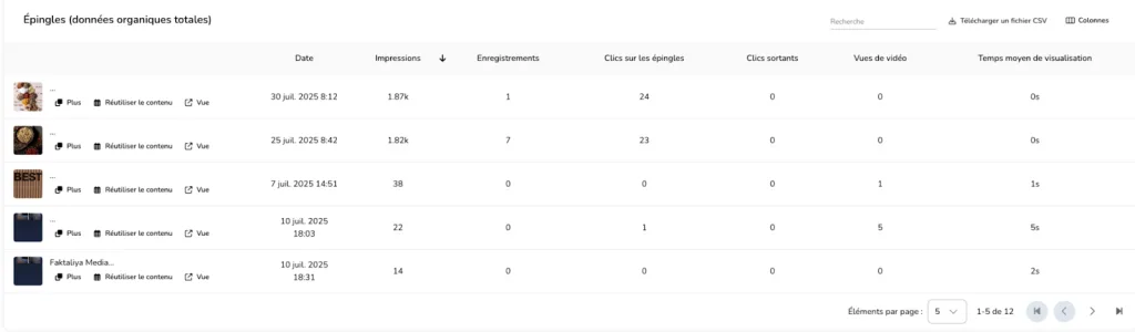 🤔 Pourquoi c’est utile : avoir une vue globale sur la performance de toutes vos épingles vous permet de comparer vos contenus, détecter des tendances et prioriser vos actions.