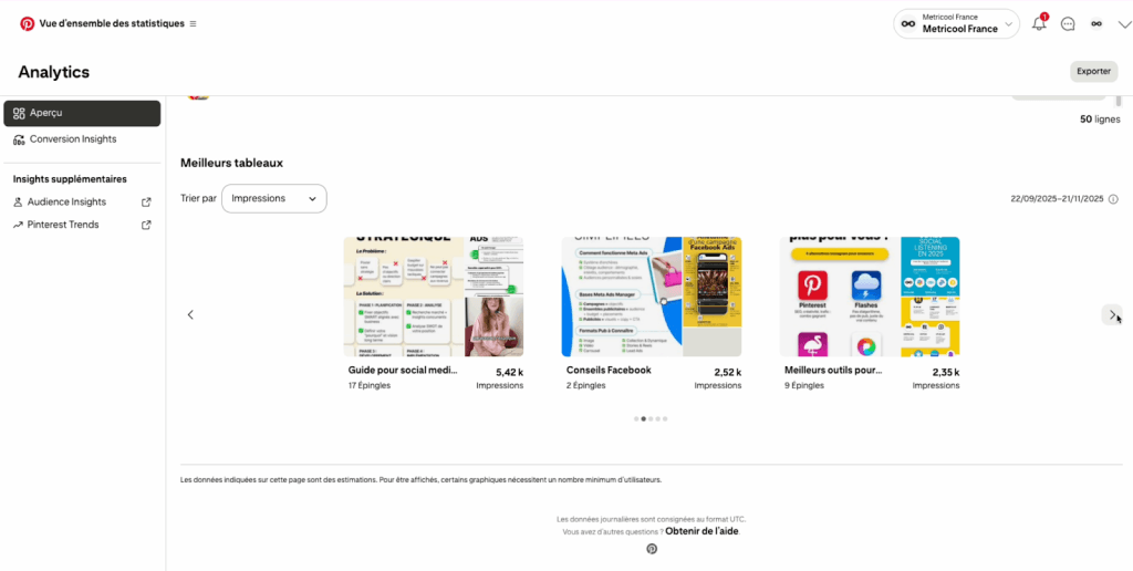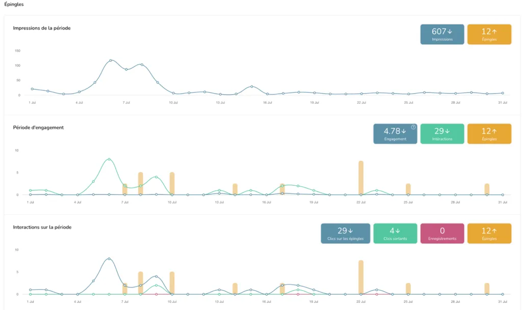 🤔 Pourquoi c’est utile : savoir quelles épingles génèrent le plus de visibilité et d’interactions vous aide à identifier les contenus qui fonctionnent et à ajuster votre stratégie.