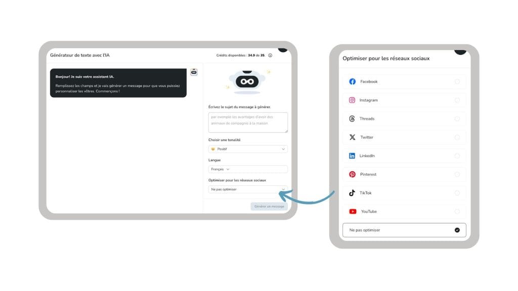 Là où l’outil fait vraiment la différence, c’est dans l’ajout d’éléments stratégiques directement dans vos contenus : appels à l’action (CTA), hashtags pertinents, emojis adaptés à votre message. Tout est pensé pour booster vos performances sans effort supplémentaire.