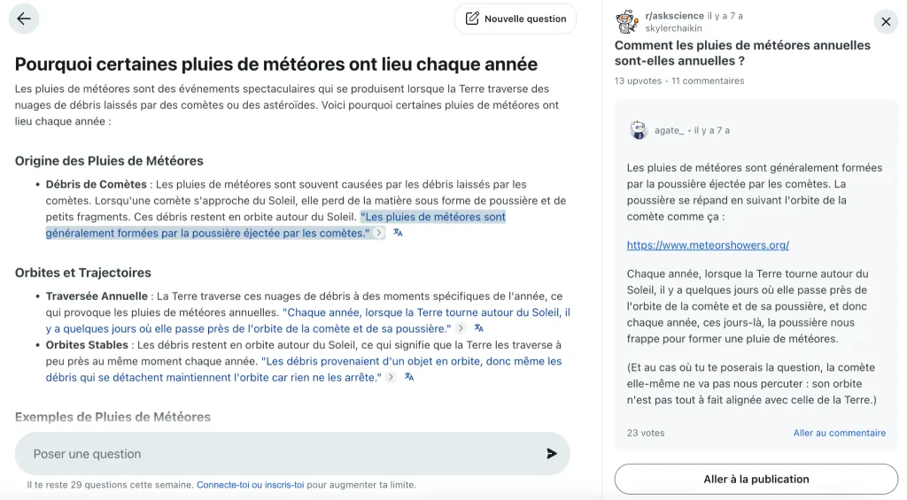 2️⃣ L’outil scanne alors les publications et commentaires publics jugés les plus pertinents, selon les votes et la popularité, pour générer une synthèse claire et contextualisée.