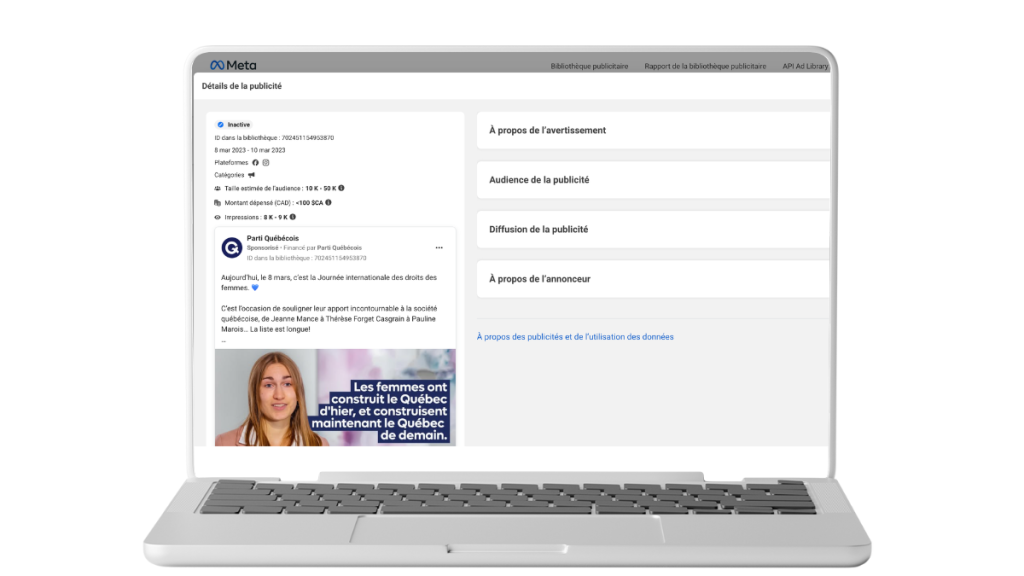 Prenons l’exemple public du Parti québécois, qui a utilisé la publicité Facebook pour s’adresser exclusivement à un public féminin lors d’une campagne mettant en avant ses candidates.