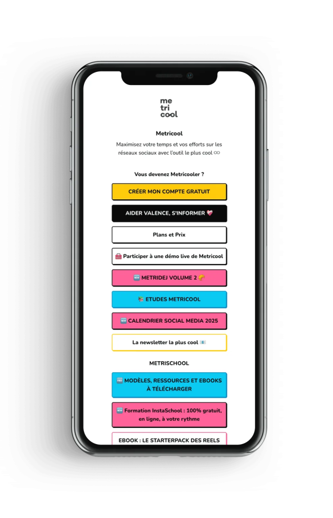Depuis Metricool, assemblez votre propre mini-site : ajoutez des boutons cliquables, des images, des vidéos ou même vos posts Instagram et TikTok. Chaque élément renvoie vers le lien de votre choix : une vidéo, un produit, un article ou votre site web.