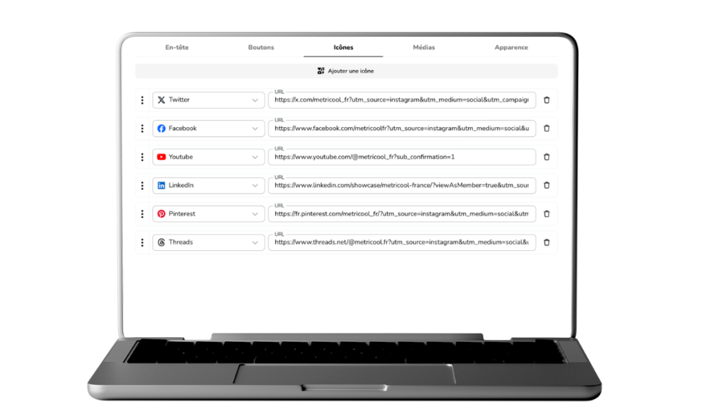 Sur l’écran, vous pouvez ajouter autant d’icônes que nécessaire : Instagram, Facebook, TikTok, LinkedIn, YouTube, WhatsApp, Spotify, Shopify, Email… et bien d’autres.