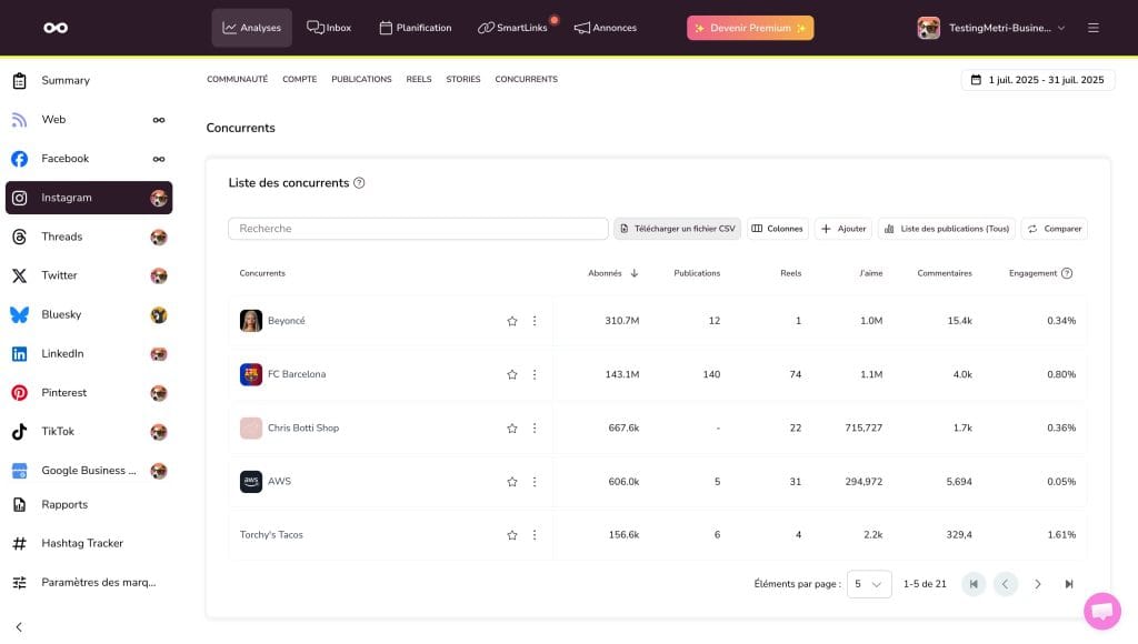 Dans cette partie, vous pouvez explorer les statistiques Instagram de vos concurrents. En les ajoutant dans le tableau, vous accédez à toutes les données pertinentes :