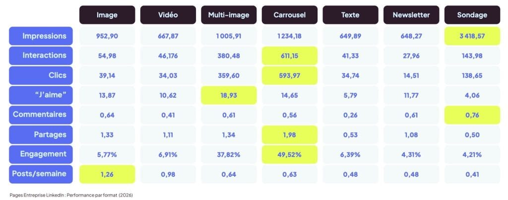 Les carrousels sur linkedIn sont particulièrement efficaces pour capter l’attention et maintenir l’engagement. Et les chiffres le confirment : d’après la dernière étude Metricool, les carrousels atteignent un taux d’engagement de 49,52 % (le plus élevé de tous les formats), avec une moyenne de 611 interactions et 594 clics par publication.