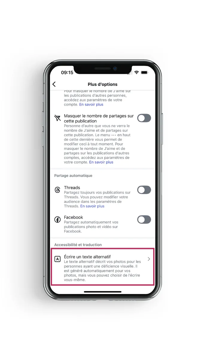 📝 Astuce : ne copiez pas simplement la légende du post. Le texte alternatif doit décrire précisément l’image.