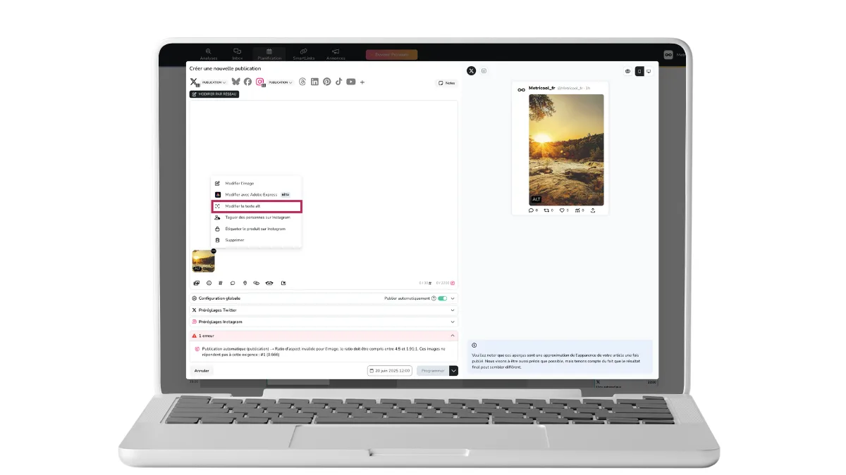 Instagram vous permet d’ajouter un texte alternatif de deux façons : au moment de la publication ou après coup. Et si vous programmez vos posts avec Metricool, c’est encore plus simple !