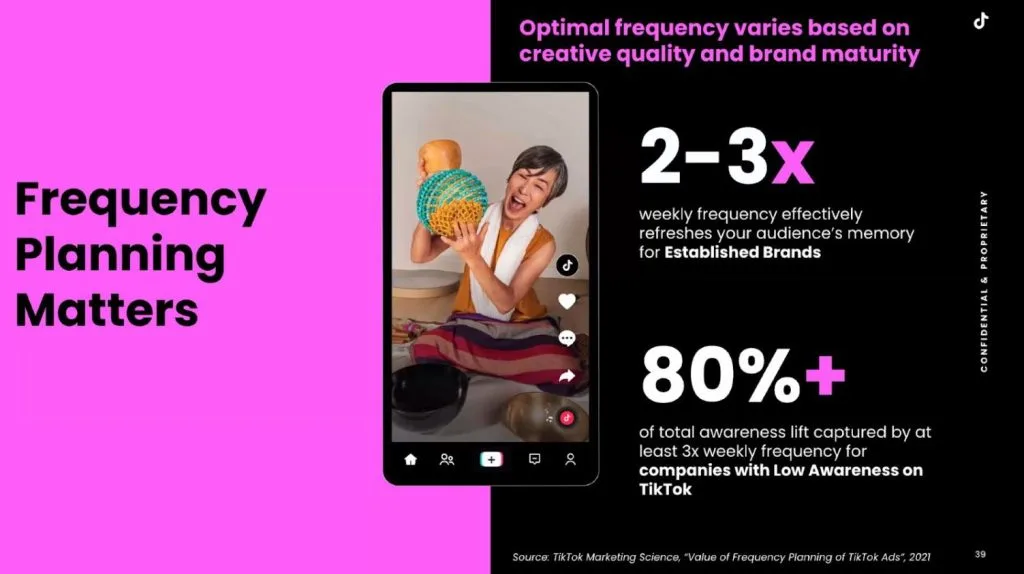 💡 Metritip : Los d’une masterclass organisée par l’équipe de TikTok pour les petites entreprises qui se lancent sur la plateforme, il a été commenté que publier entre 2 à 3 fois par semaine était amplement suffisant. Pensez à voir en fonction de votre contenu, de votre temps et de votre régularité et adaptez. Voici, l’image partagée lors de l’évènement :