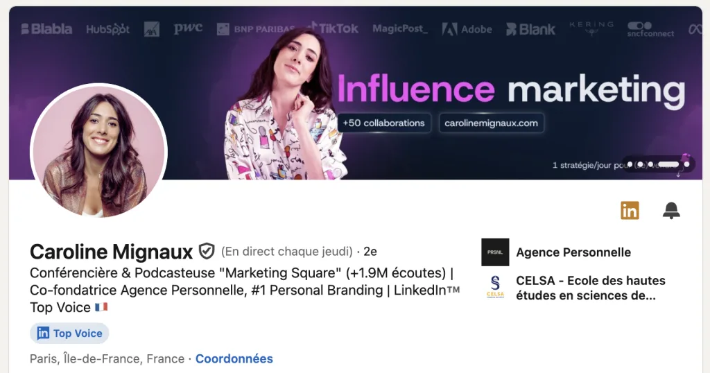 Caroline Mignaux – Influente dans le co-branding et le Growth marketing, elle valorise l’interaction avec ses nombreux abonnés pour affiner son message et maximiser son impact. Co-fondatrice de Agence Personnelle et fondatrice du Podcast Marketing Square, elle partage également son expertise sur les réseaux sociaux, l’emailing et la stratégie de contenu.