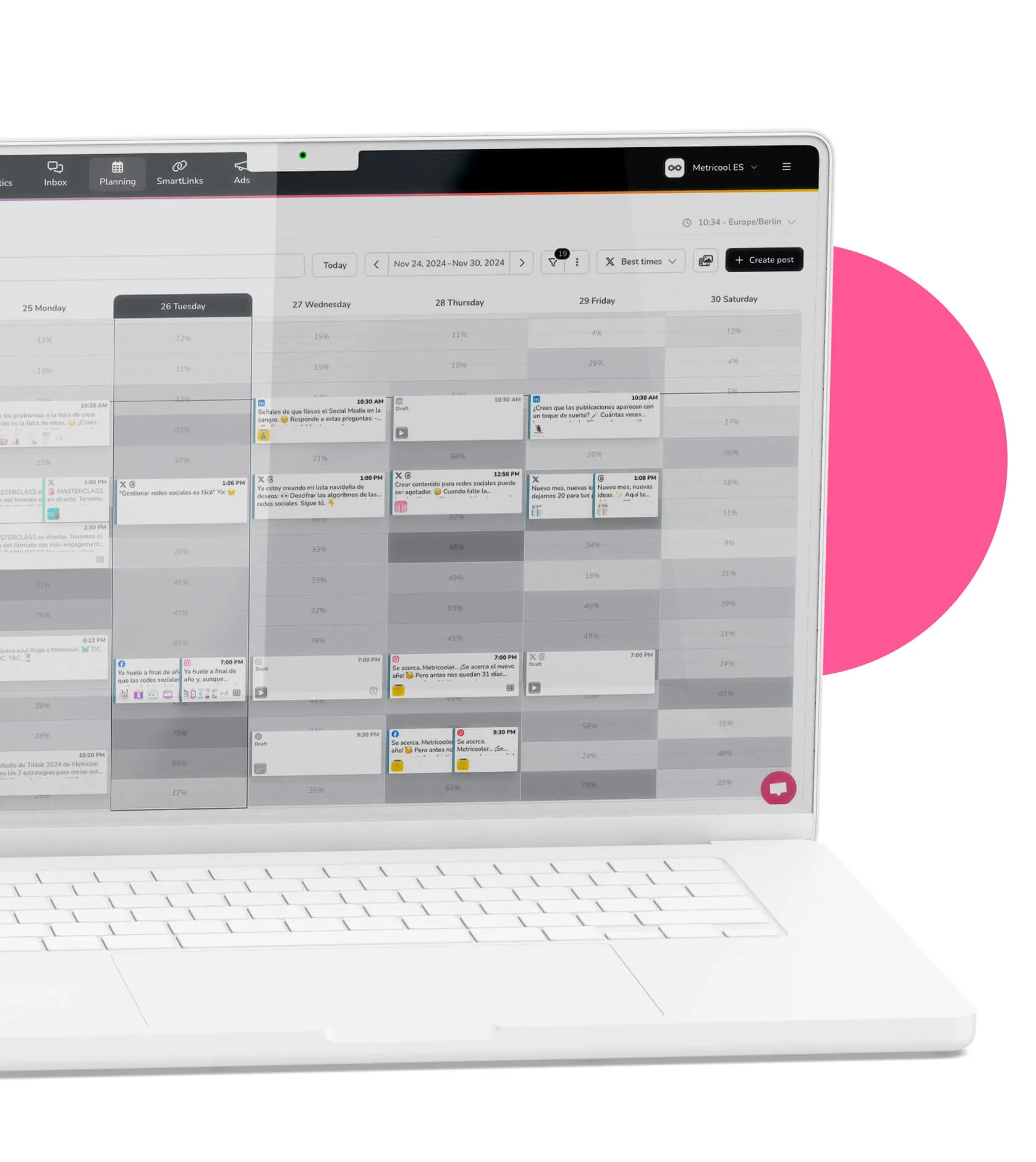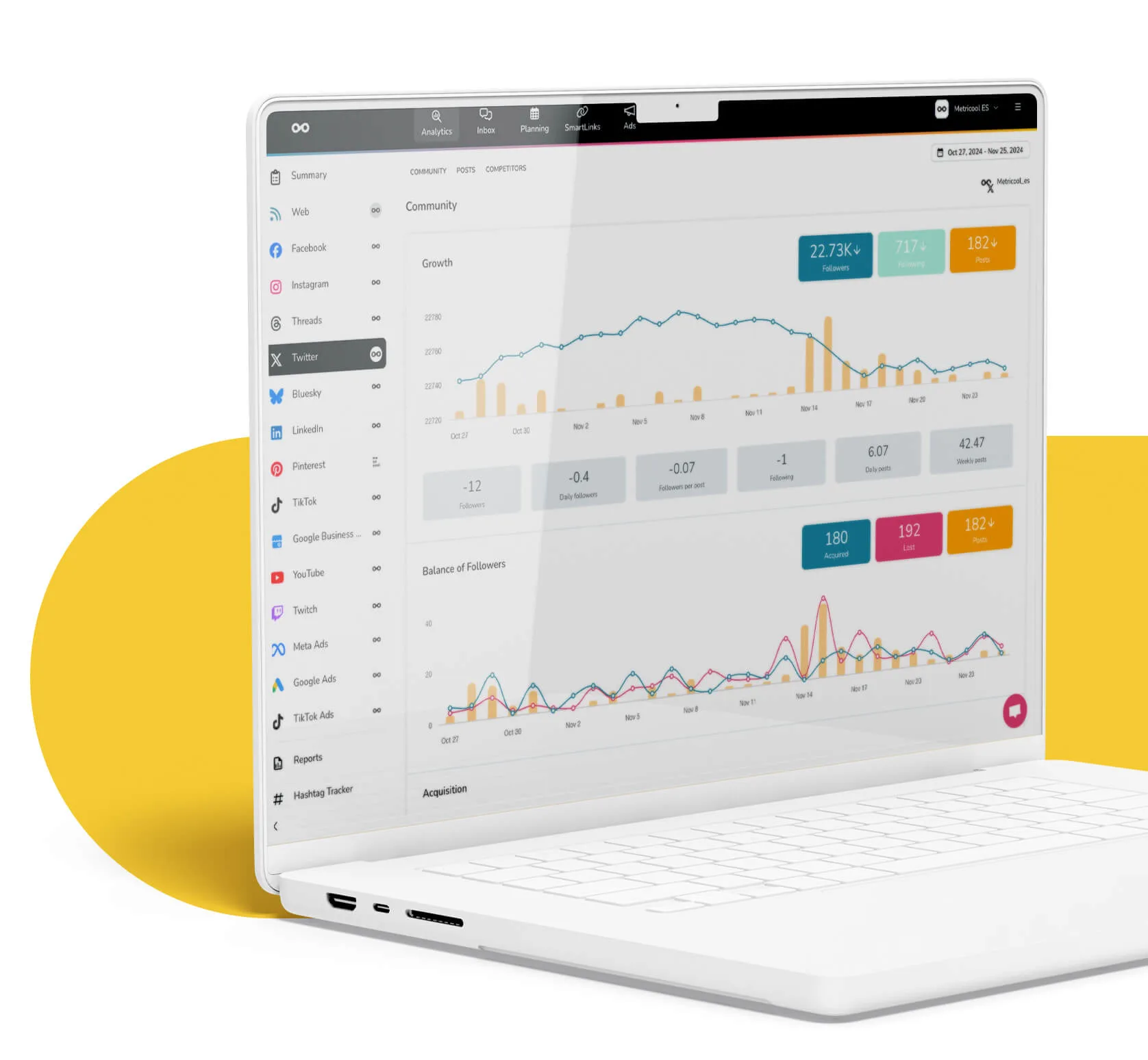 Arrêtez de perdre du temps avec des méthodes archaïques. Avec Metricool, simplifiez la gestion et l’analyse de votre compte Twitter. Focalisez-vous sur votre cœur de métier, nous gérons le reste.