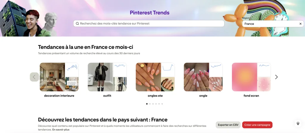 L’idée est d’être présent au bon moment avec le bon contenu. Pinterests propose 2 outils pour vous aider à repérer les sujets qui montent et anticiper la demande :
