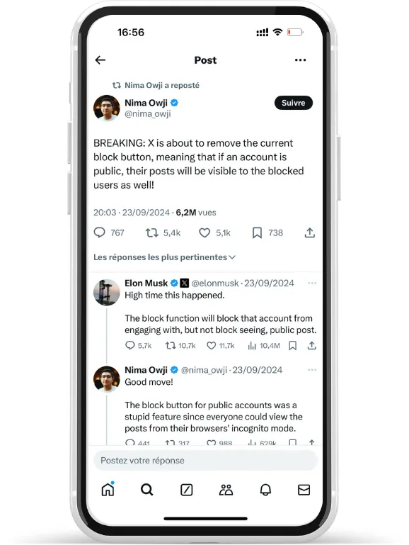 Elon Musk avait lui même confirmé la nouvelle en répondant à un utilisateur sur X : si votre compte est public, les utilisateurs que vous avez bloqués pourront désormais voir vos contenus.