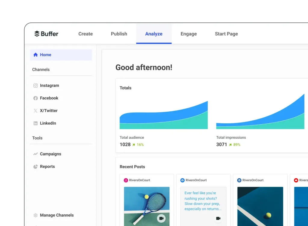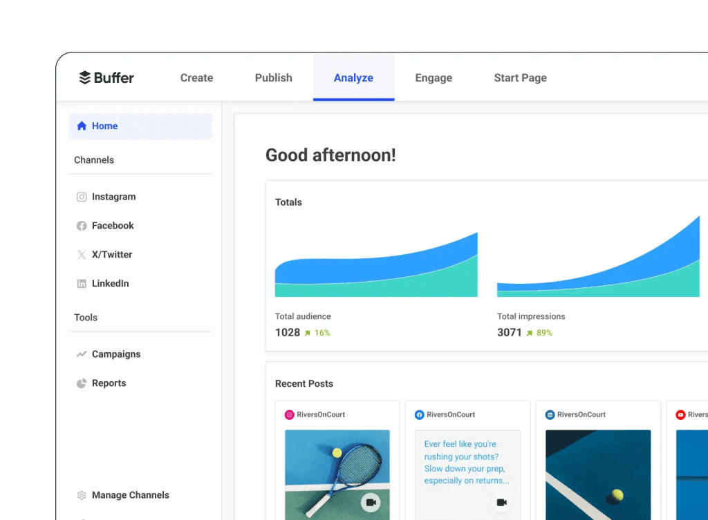 Buffer is a simple, flexible social media management tool that puts publishing, scheduling, and collaboration in one place, especially helpful if you want something lightweight but still powerful.