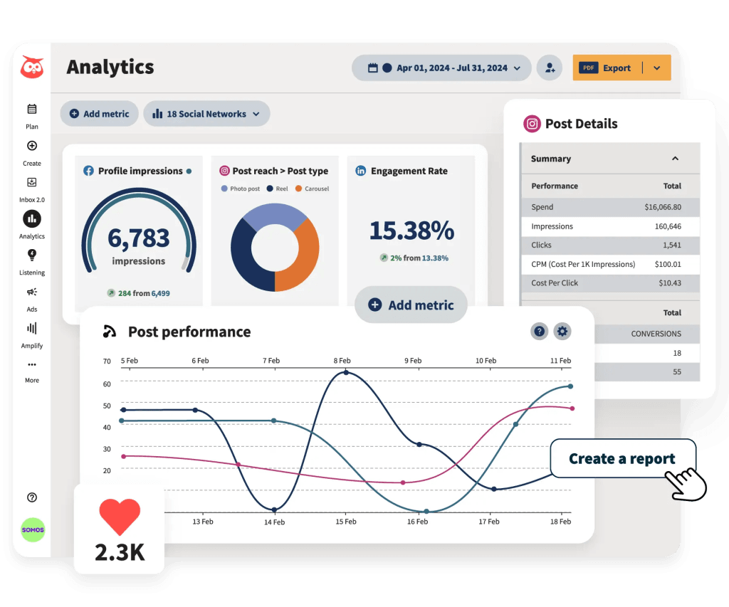 - Analyze performance: Track engagement, impressions, clicks, follower growth, website traffic, and more, with detailed historical and real-time analytics.