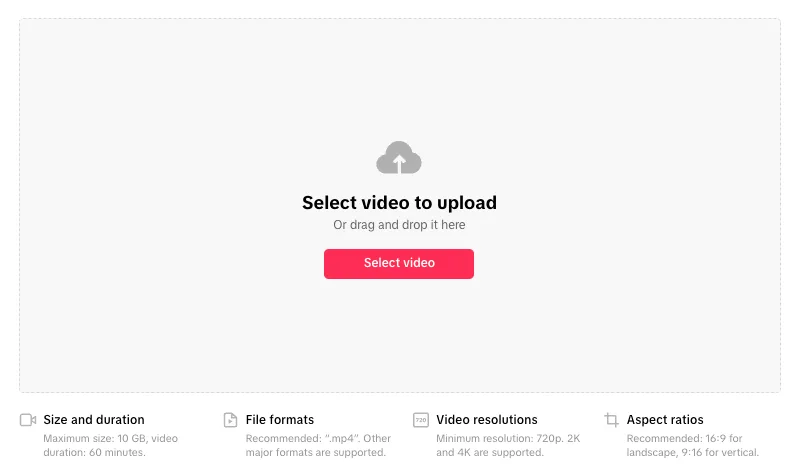- Upload: Click the red “Upload” button to upload or drag files into the platform. TikTok Studio doesn’t support TikTok carousels yet.