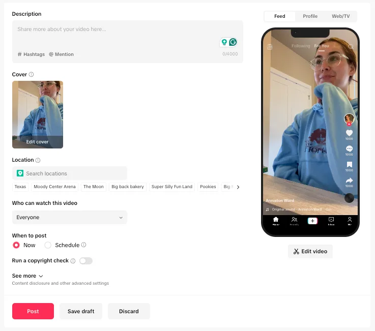 - Add details: Add a description, hashtags, mentions, and location. Select your cover image, audience, and when to post. You can post the content immediately or schedule it for a later date.