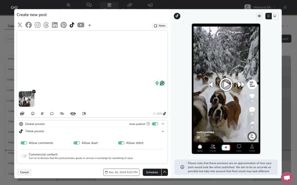 Metricool is an all-in-one social media scheduling, analysis, and management tool for all social media platforms. While you can create, schedule, and auto-publish TikTok content, you can analyze content performance to optimize your strategy.