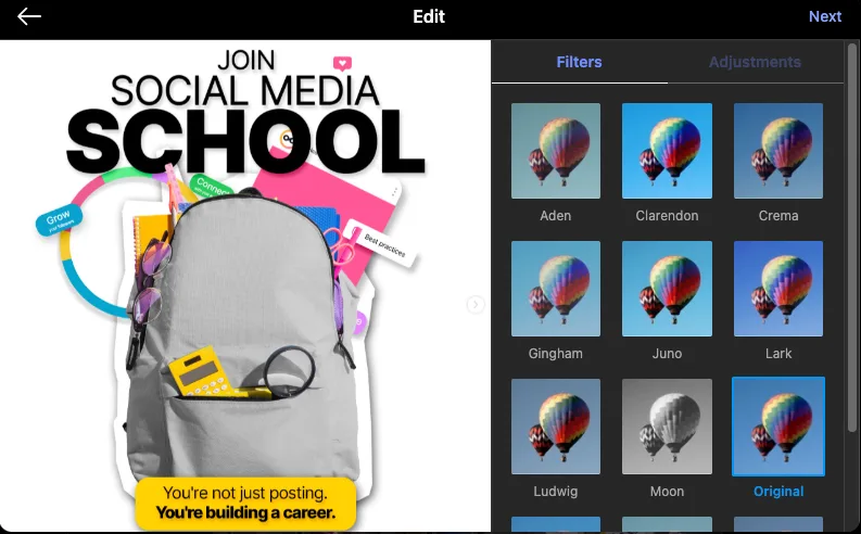 4. Edit your photo with filters or visual adjustments and press “Next” (Or press “Next” immediately, if you don’t need to do any edits).