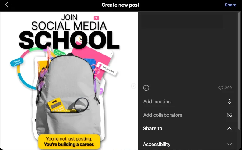 5. Add your caption, location, tags, and collaborators and press “Share”.