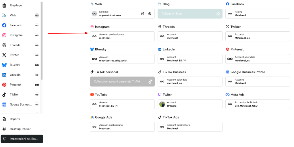 Questo è necessario per abilitare l’accesso ai dati professionali. - Connetti il tuo profilo Instagram a Metricool. Accedi a Metricool, clicca su “Instagram” nel menu di sinistra e collega la tua pagina. Ti apparirà il tuo profilo collegato.