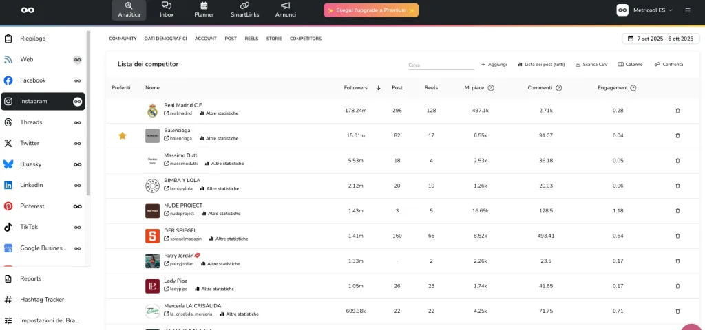 Dati disponibili nell’analisi competitor Instagram di Metricool