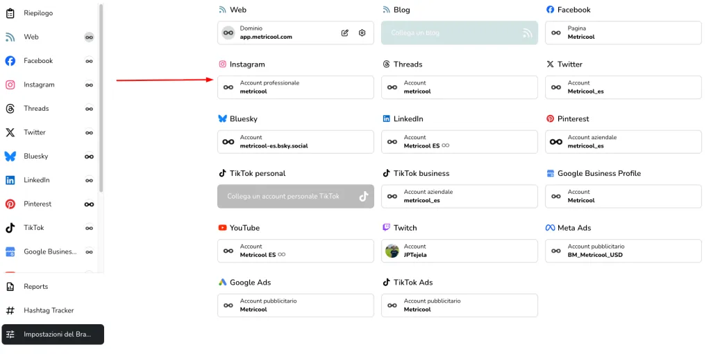 Questo è necessario per abilitare l’accesso ai dati professionali. - Connetti il tuo profilo Instagram a Metricool. Accedi a Metricool, clicca su “Instagram” nel menu di sinistra e collega la tua pagina. Ti apparirà il tuo profilo collegato.