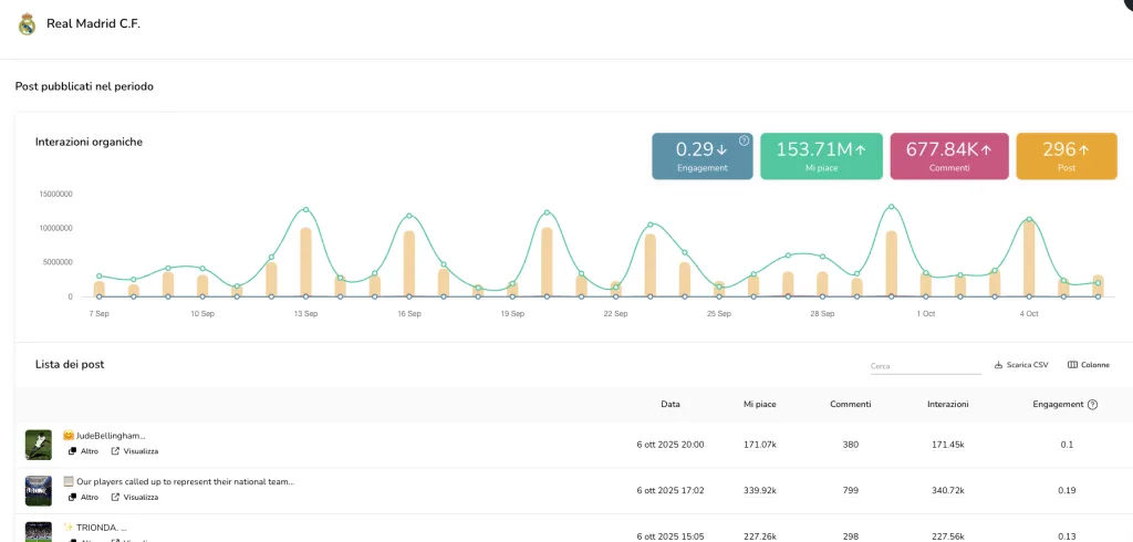 Cliccando su “Pubblicazioni”, puoi vedere tutti i post dei tuoi competitor, con data, tipo di contenuto, interazioni e un link diretto al post su Instagram.