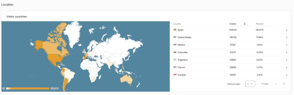 Analizza l’origine geografica dei tuoi visitatori per perfezionare la tua comunicazione e personalizzare i contenuti in base alle specificità locali. Metricool ti fornisce dati dettagliati, mostrando il numero di visitatori per ogni paese e la relativa percentuale.