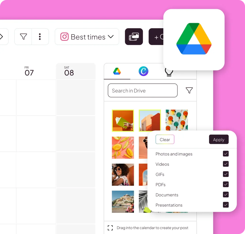 Esplora le tue cartelle su Google Drive, personali o condivise, e accedi ai file direttamente dal planner. Filtra e seleziona immagini, video, e PDF compatibili, tutto da un’unica scheda. Più semplice di così!