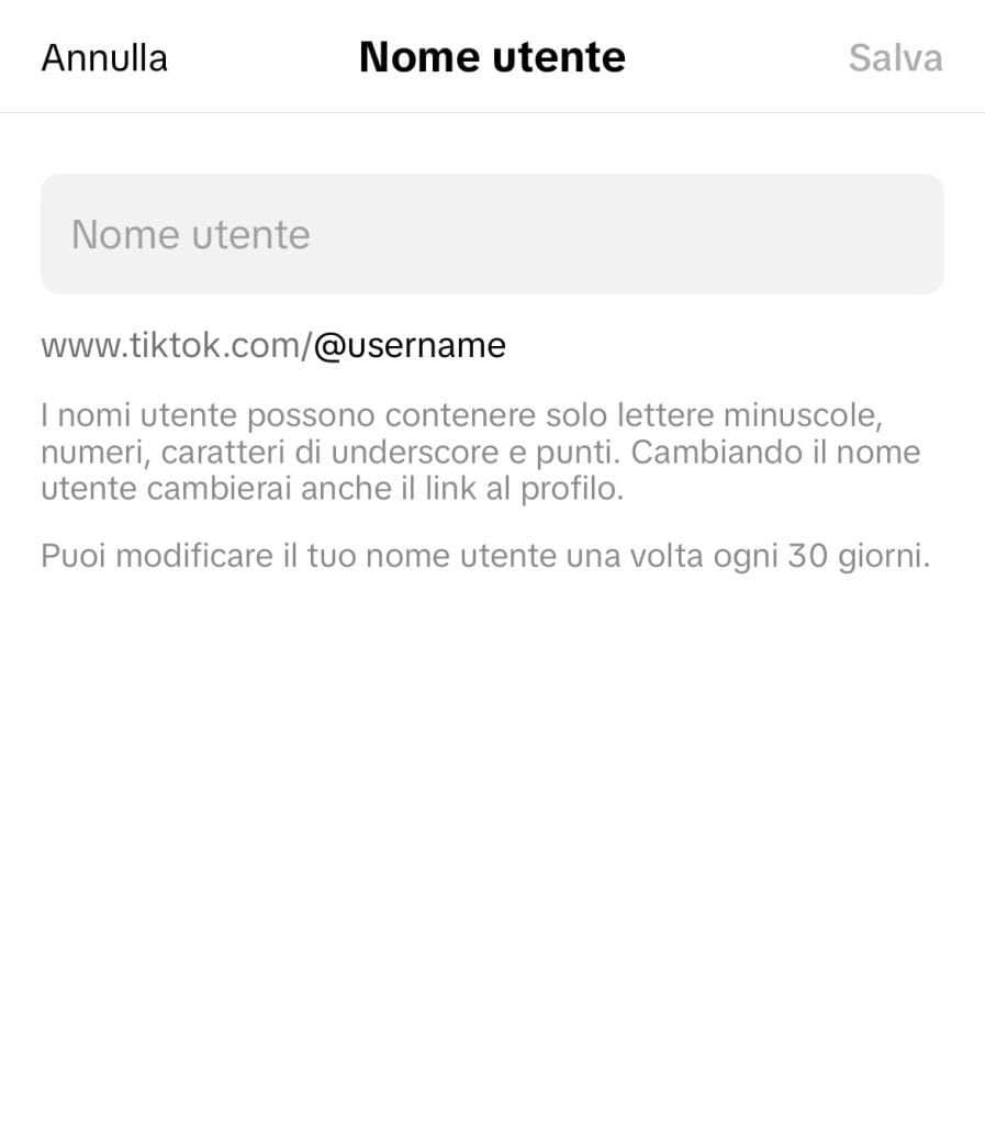 - Username: è il nome preceduto da “@” che appare nel link al tuo profilo (es. tiktok.com/@nomeutente). Deve essere univoco e può essere modificato solo una volta ogni 30 giorni.