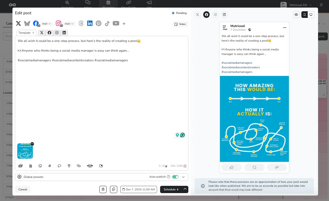 Metricool è uno strumento professionale per gestire la tua strategia di social media marketing. Oltre alla programmazione standard permette di: