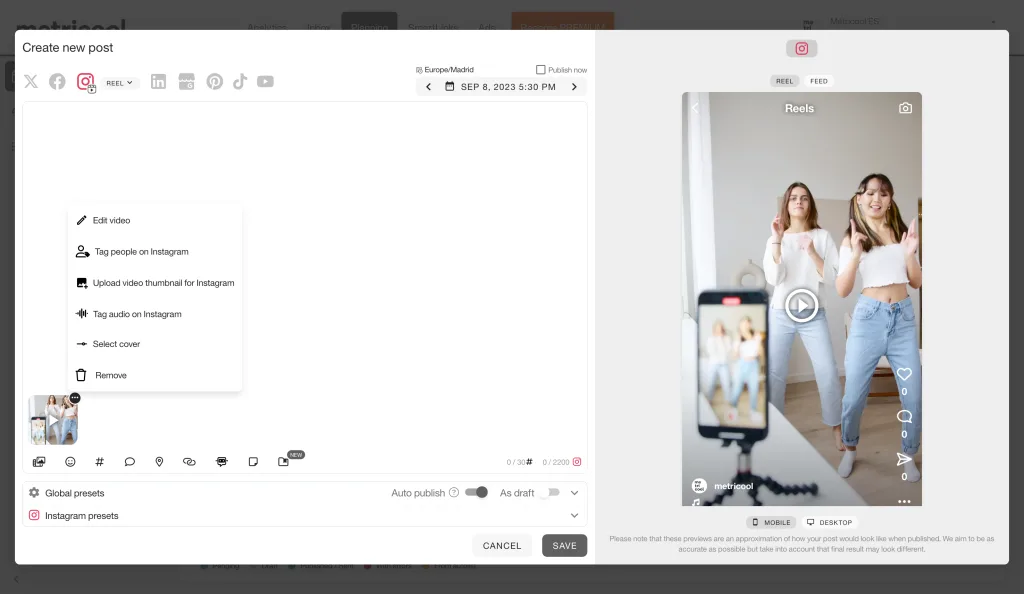 In questo caso puoi programmare i Reels in anticipo utilizzando strumenti di gestione social come Metricool.