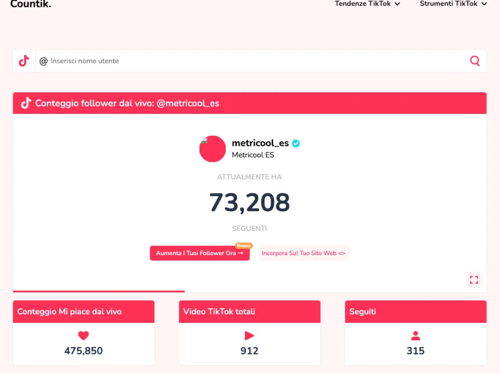 TokCounter è una delle piattaforme più conosciute per monitorare il numero esatto di follower TikTok in tempo reale, semplicemente inserendo il nome utente.Ma non si ferma qui: ti mostra anche like totali, numero di profili seguiti e video pubblicati, offrendo una panoramica completa di ogni account.