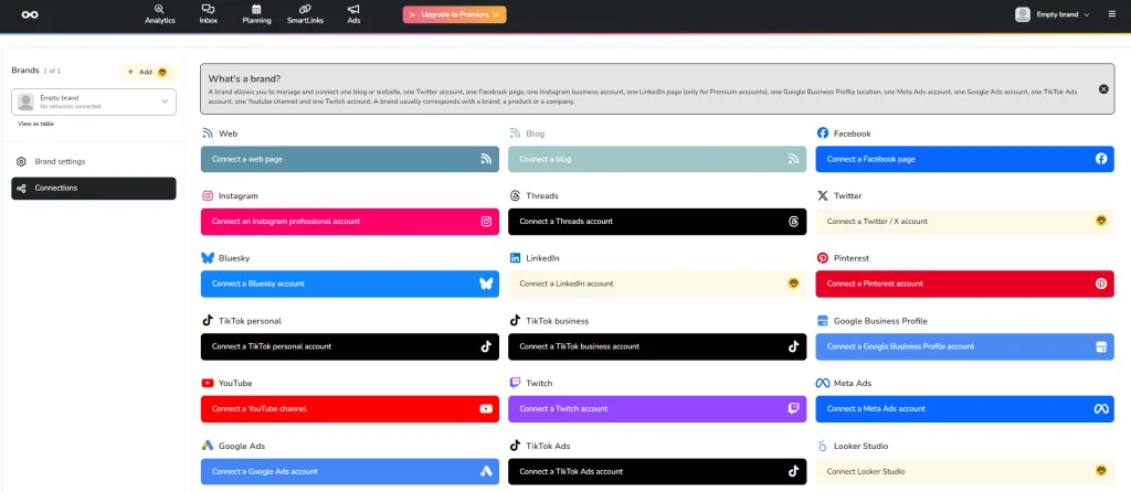 Creare un account. Puoi scegliere tra l’opzione gratuita o quella Premium, a seconda del numero di brand che devi gestire.