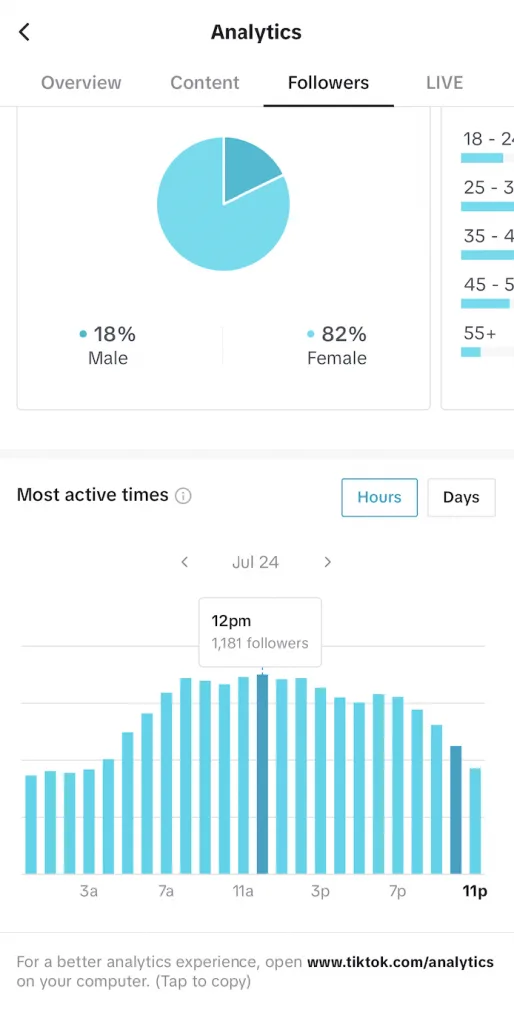 TikTok mette a disposizione dati dettagliati sui tuoi follower, inclusi gli orari in cui sono più attivi. Seguire queste informazioni ti aiuterà a pubblicare nel momento giusto.