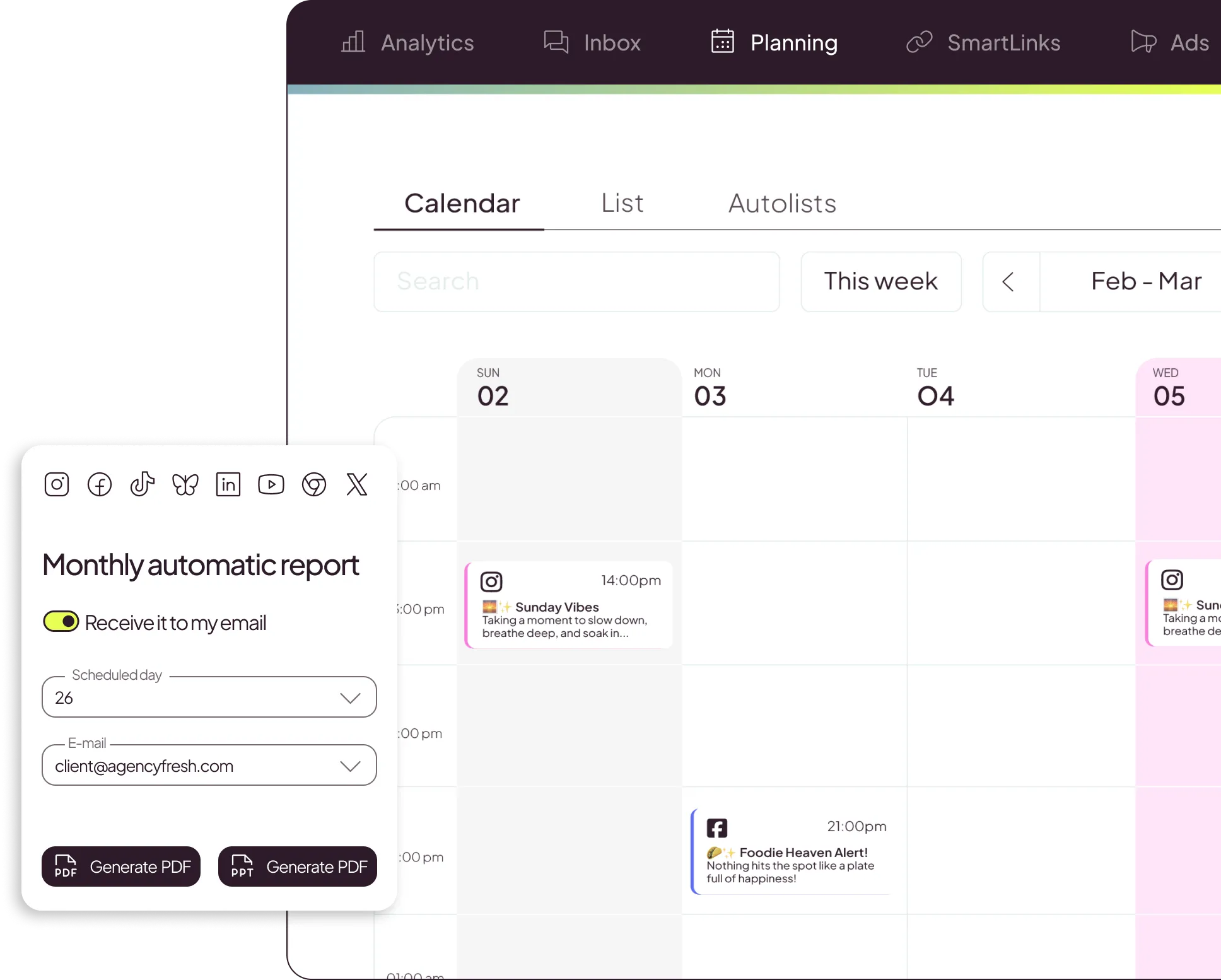 Il nostro Planner velocizza la programmazione dei contenuti così puoi reinvestire quel tempo in ciò che davvero conta per la tua agenzia.