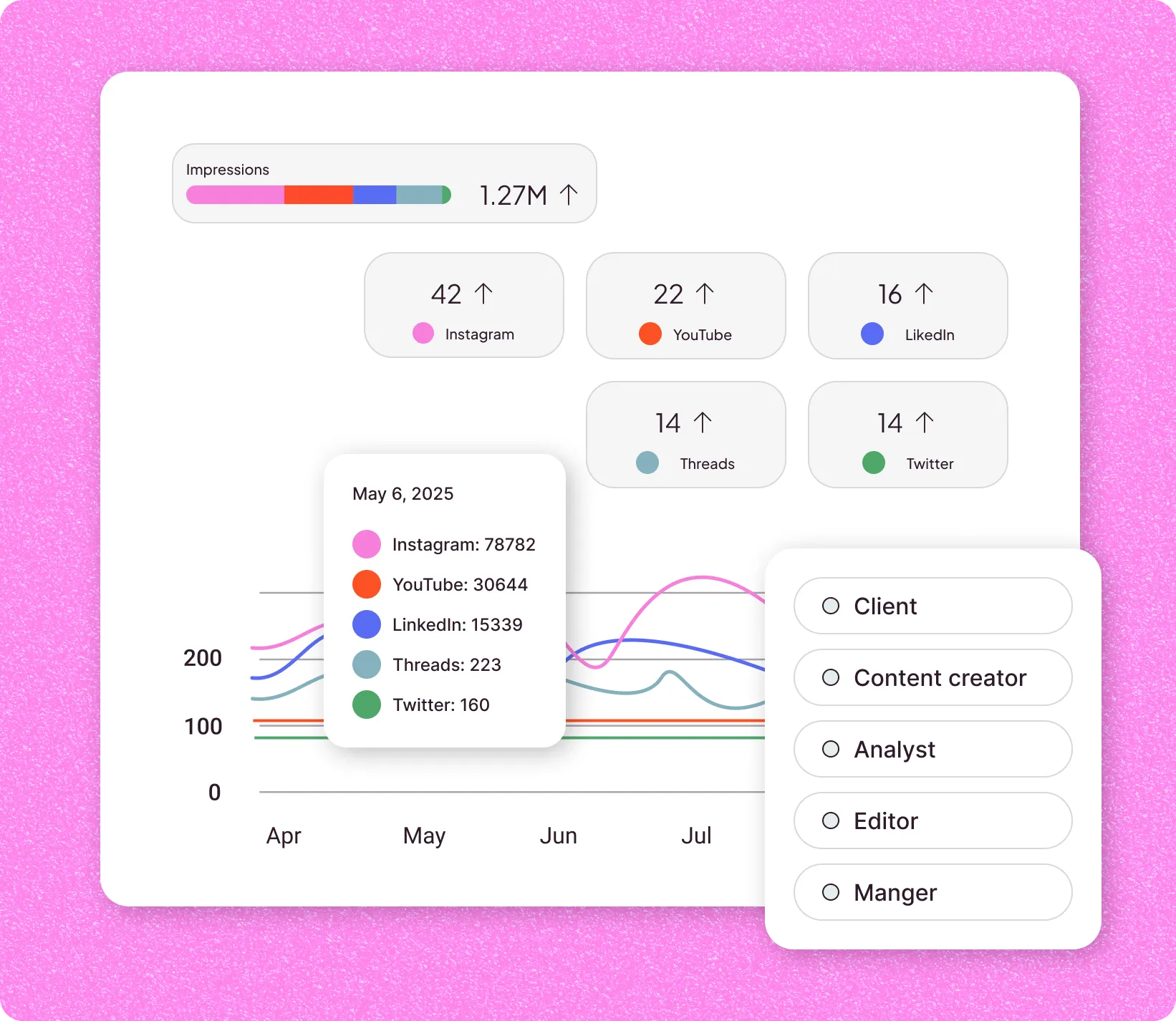 Metriche in un clicAnalizza le performance di ogni social con dashboard intuitive.