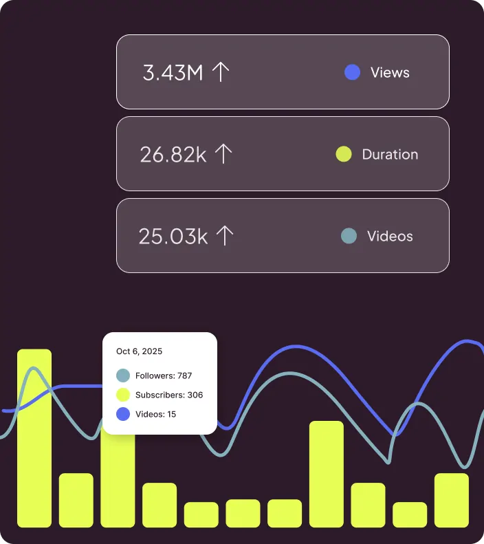 Analizza l’evoluzione del tuo canale, la crescita dei tuoi iscritti e le performance di ogni streaming. Tutto in dashboard intuitive e facili da leggere.