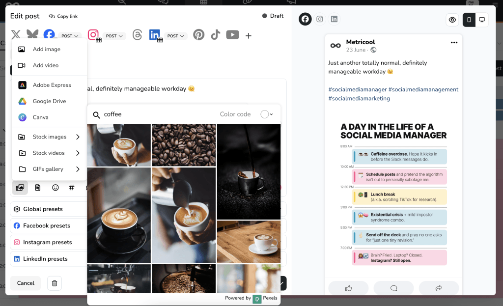 Even the best content creators hit a wall now and then. Whether you’re low on time, inspiration, or original content, Metricool’s image and video libraries are here to save the day.