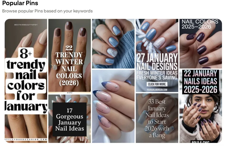 Winter means inside time, so creativity thrives on Pinterest during this season. Seasonal nail designs and fashion inspo are also popular, and of course, travel plans!