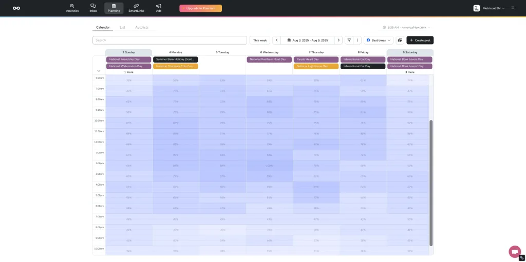 The timing of your posts can make a big difference in how many people see and interact with them. With Metricool, finding the best times to post on Facebook is simple. Head to the Planning section, click Best Times to Post, and choose Facebook. The darkest blue areas on the calendar show when your audience is most active. Schedule your posts during those hours to improve visibility and engagement. You can use this feature across other platforms like Instagram and TikTok as well, which helps you build a smarter overall content plan.