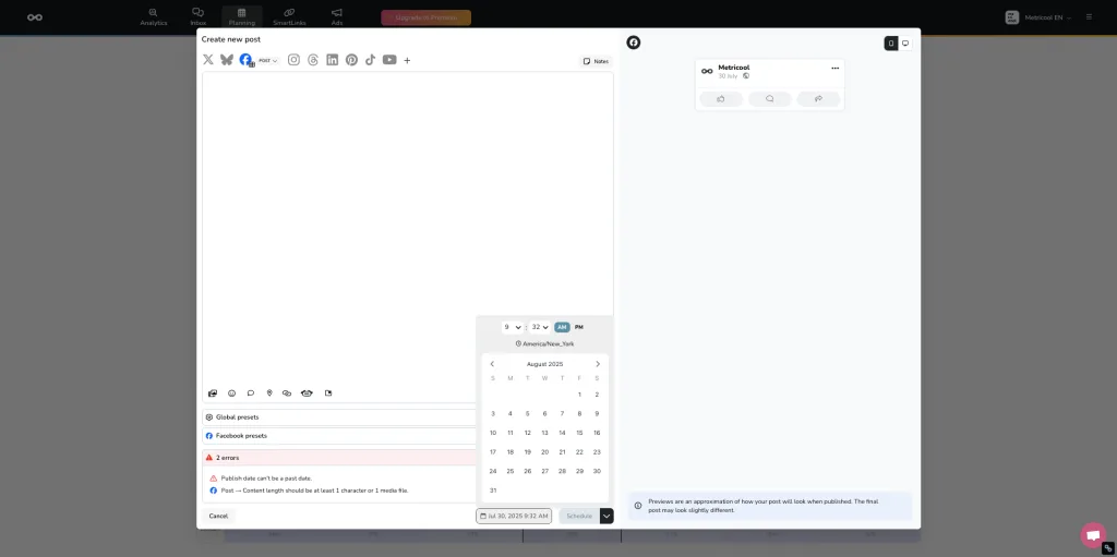 However, with Metricool, you can schedule posts for any type of Facebook account, including personal ones. Just connect your profile to Metricool, head to the Planner, create your post, and pick a date and time. Once you’ve set it up, Metricool will take care of publishing it automatically.