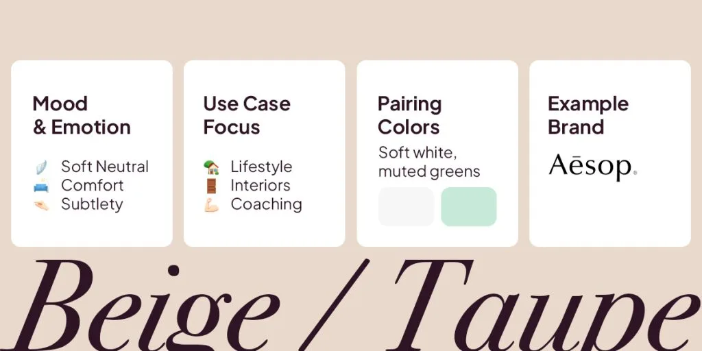 Beige, taupe, and soft neutrals convey warmth, comfort, and understated sophistication. They work especially well for the rise of “quiet luxury” and high-end wellness brands, giving visuals a polished, serene feel without shouting for attention.