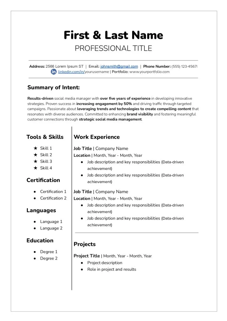 Work Experience and Projects: Detail your achievements with numbers and examples, such as “Grew Instagram followers from 15,000 to 50,000 in six months” or “Increased LinkedIn engagement by 60% with targeted campaigns.” Highlight teamwork, cross-platform projects, and your ability to adapt to trends and platform changes.