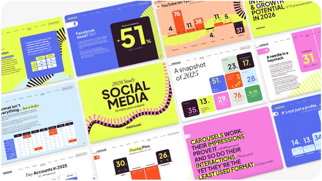 In our Social Media Study 2026, we reviewed more than 39 million posts from over a million real accounts. This report contains hundreds of pages that show what brands, businesses, and creators actually did on each platform over the past year.