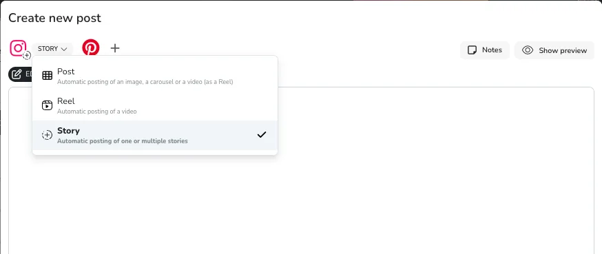2. Click on the tab to the right of the Instagram icon and select the ‘Story’ option.