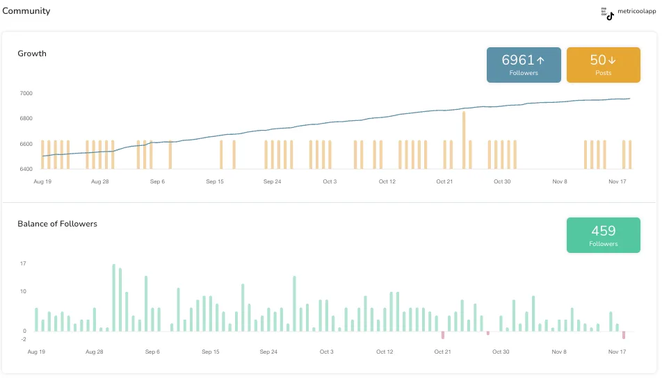 Metricool’s Analytics track follower growth and balance. Compare followers against the days your account posted, to identify peaks. The follower balance chart helps you understand acquisition and loss over time.