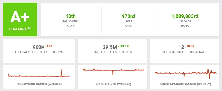 Finally, Social Blade provides TikTok stats regarding the most followed users on the app. Users can also enter their usernames to monitor gained followers, likes, and uploads by month. This also provides a “total grade” based on the previous factors and Social Blade’s database.