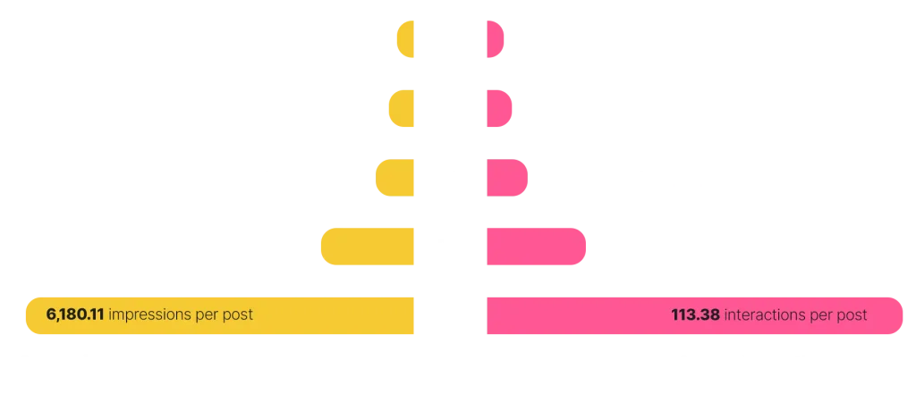 If we focus on interactions by account size, the accounts with the most followers receive the highest number of likes, an average of 47.95 per post. This coincides with reposts (11.46 on average), replies (4.69 on average), quotes (1.63 on average), profile clicks (15.11 on average), and link clicks (32.54 on average).